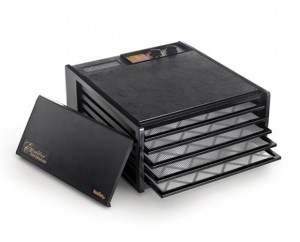 Ce déshydrateur fait partie de l'excellente gamme Excalibur. Il possède 5 plateaux plastiques (sans BPA) en tiroirs et l'air est très bien ventilée horizontalement sur tous les plateaux. Le minuteur de 1 à 26 heures permet d'arrêter le déshydrateur au bout d'un temps définit. Ce modèle est